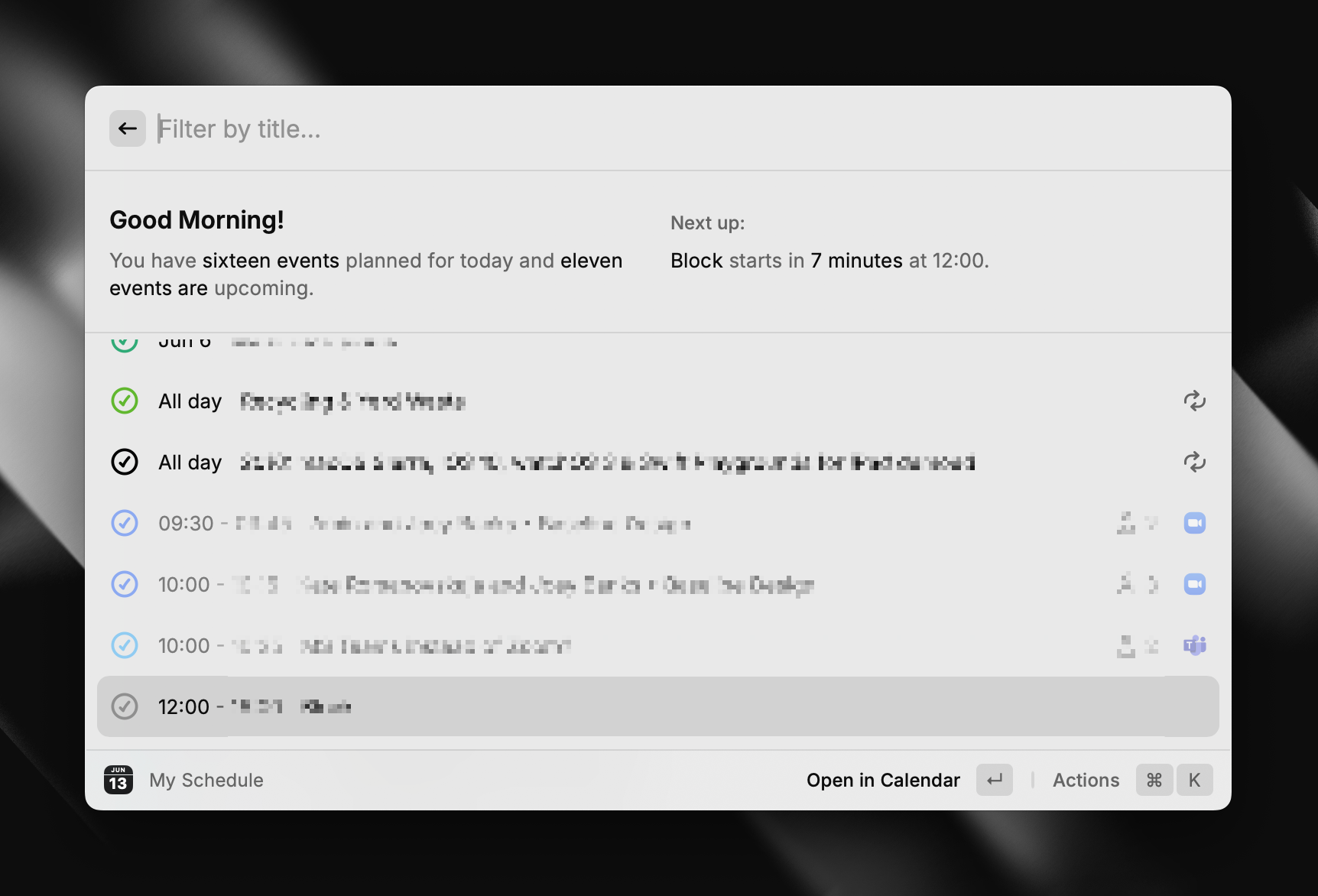 Another recent discovery is the calendar extension, which connects to your Mac’s Calendar and displays everything that’s up ahead. Simple enough, but what’s so great about this one in Raycast is its ability to place the upcoming event in your Mac’s Menu Bar and allows you to preview yourself on video before joining. It's a small thing, but this extension can go a long way when you’re on video calls all day!