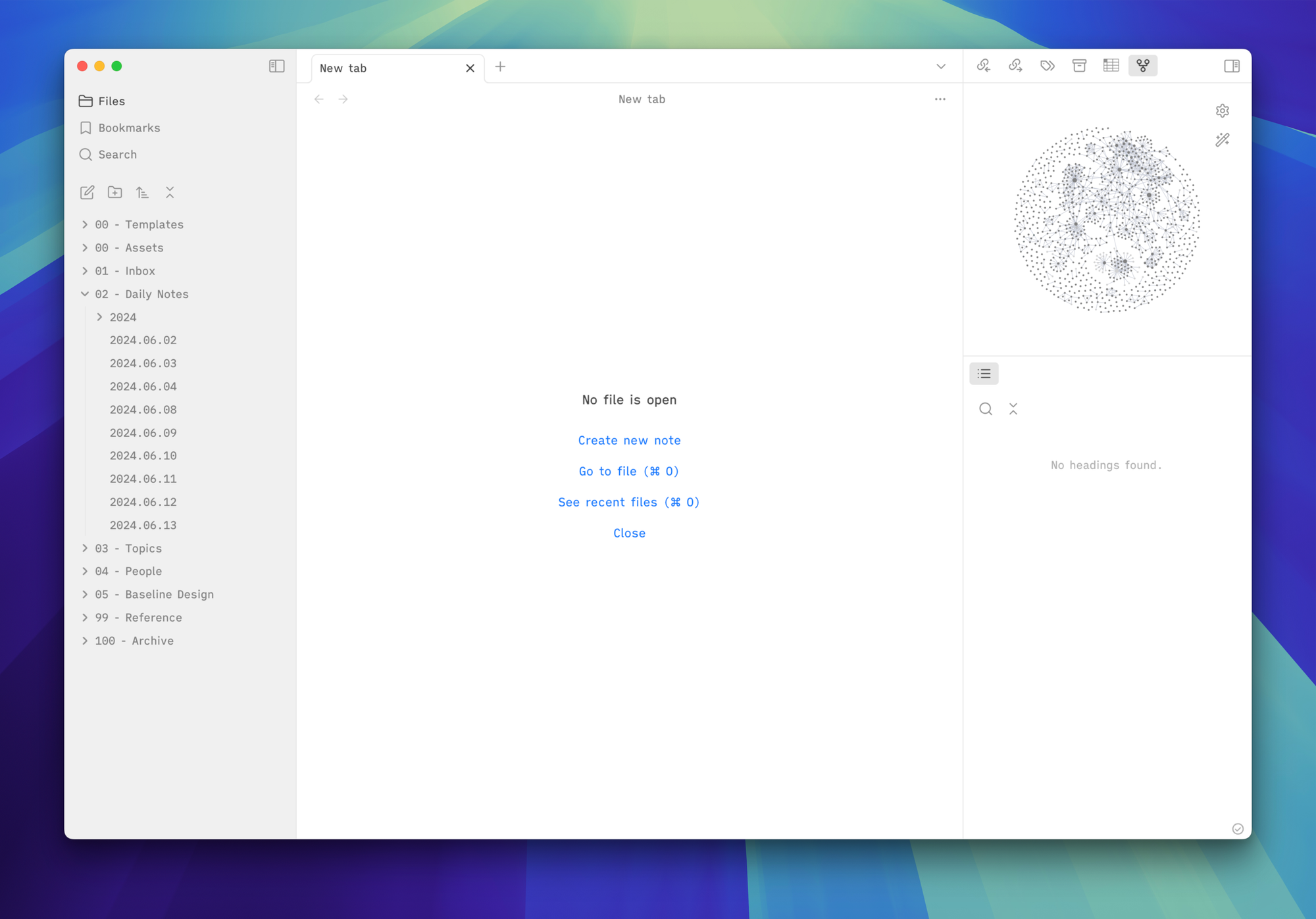 Within my Obsidian space, I try to keep notes within folders as much as possible, and organization starts with nine folders: Templates, Assets, Inbox, Daily Notes, Topics, People, Baseline Design, Reference, Archive. Within each of those folders (330 in total) are dozens of other folders to help me store all of the 1,100 notes I have within my Obsidian Vault.