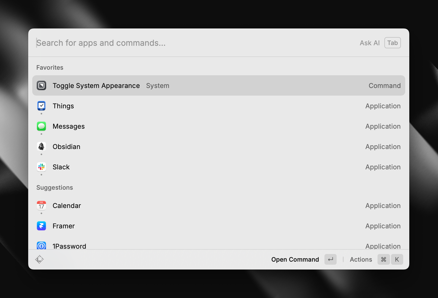 Matt Birchler from A Better Computer recently shared a video highlighting ten useful Raycast extensions, and it’s worth checking out if you’re interested in trying this tool. What I love about Raycast is the inclusion of favorites, which lets me open apps and reference actions faster. For example, I pinned “Toggle System Appearance,” which adjusts macOS’s theme, and I can access this by opening Raycast and then tapping CMD + 1. Super easy!