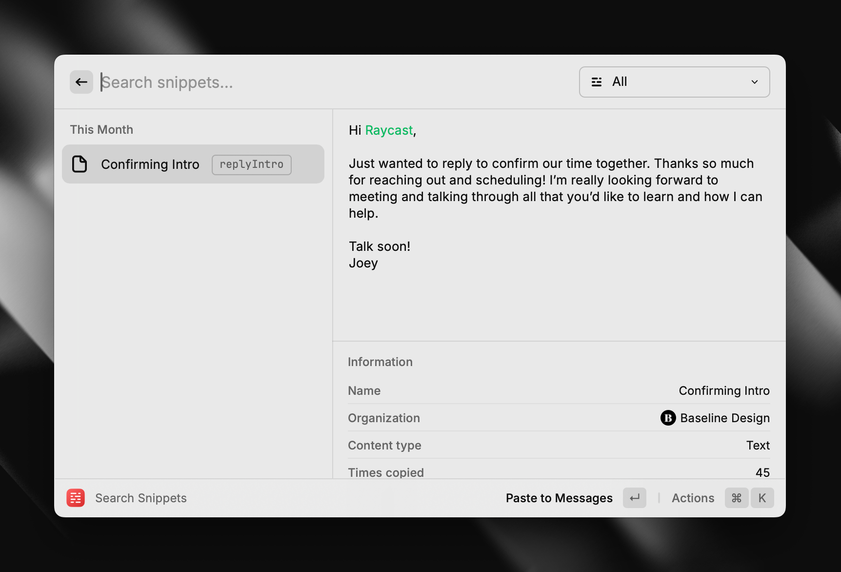 Another use I’ve found for Raycast is the Snippets feature. Snippets allow you to store, search, and insert frequently used text, which replaces other apps and services I previously needed to rely on. Whenever a new invite comes in for an intro call related to a training session, I like to reply to that individual to let them know I’ve got their invite and our time is all confirmed, but because that string of text is often the same, I decided to store that snippet of text within Snippets. What’s great is that the body of text can contain a placeholder for inserting what’s on your clipboard, which helps alleviate my biggest fear of accidentally misspelling someone’s name.