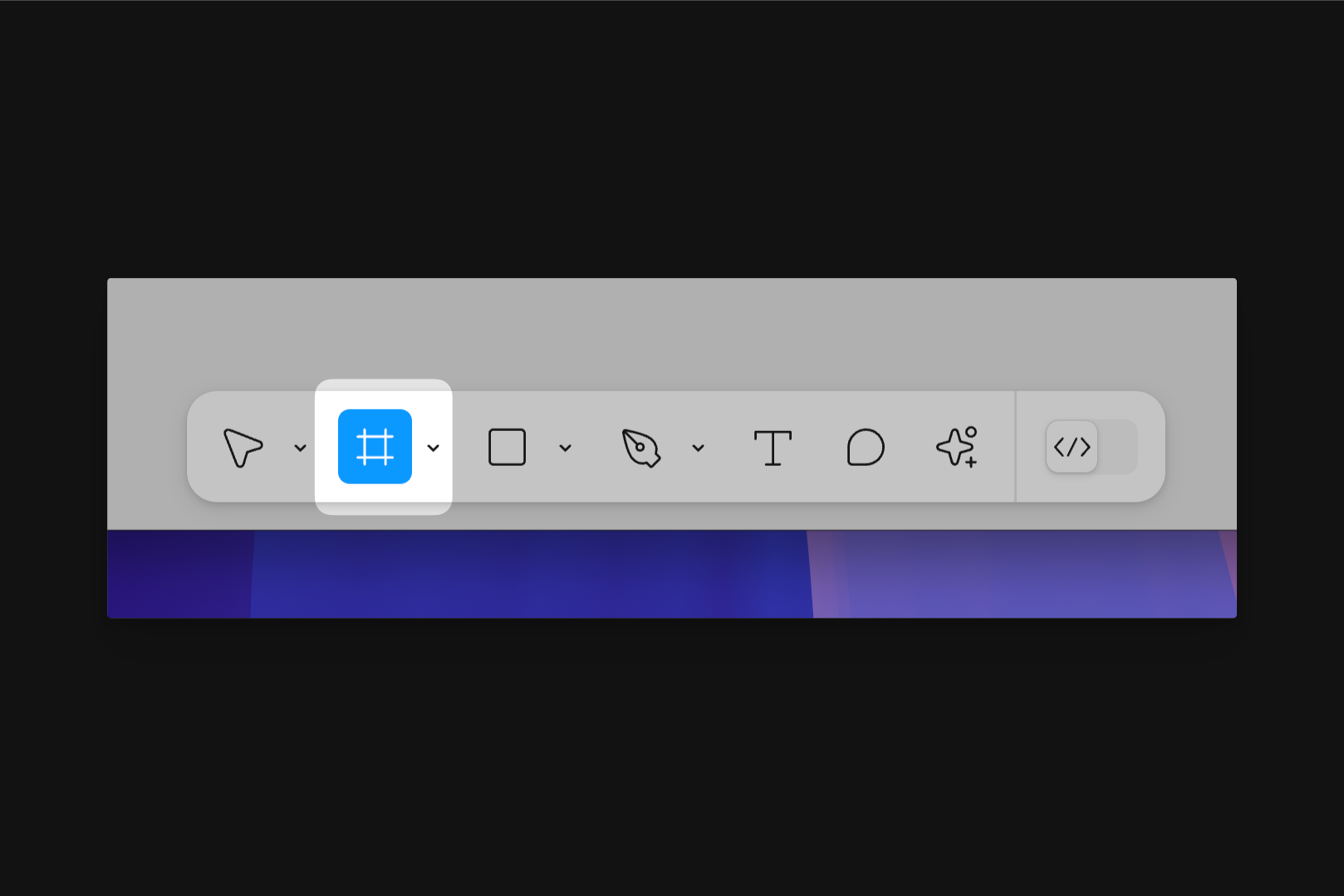 We can create frames by tapping F on the keyboard or navigating to the new toolbar near the bottom of Figma—just look to the far left for the frame tool. Once selected, we can either choose from a preset size from the Properties Panel on the right, or we can manually create a frame on the canvas or inside an existing frame, adjusting it to the needed size.